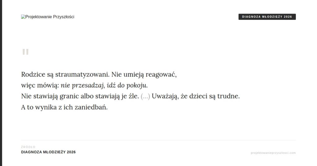 Ona diagnozuje system. Ona rozumie, że jej rodzice też nie dostali narzędzi. Że nikt ich nie nauczył rozmawiać o emocjach. Raport to potwierdza: część rodzin „nie dysponuje wystarczającymi kompetencjami emocjonalnymi do wspierania dzieci w radzeniu sobie z napięciem” (str. 12).