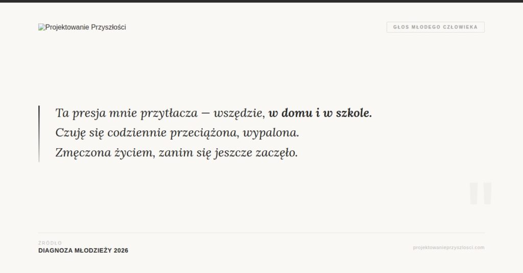 „Ta presja mnie przytłacza, wszędzie, w domu i w szkole. Czuję się codziennie przeciążona, wypalona. Zmęczona życiem, zanim się jeszcze zaczęło.”