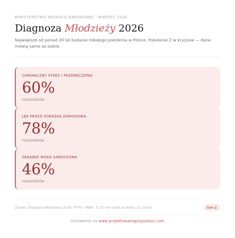 Prawie czworo na pięcioro nastolatków w wieku 15–18 lat już teraz odczuwa lęk przed tym, że nie poradzi sobie zawodowo (str. 11). Jeszcze nie skończyli liceum, a już czują ten ciężar. To jest dokładnie ten lęk, z którym pracuję na co dzień w ramach projektowania przyszłości dla nastolatków.